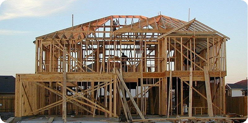 Most homes now are what they call stick-frame construction or light frame construction. light-frame construction, is a building technique based around structural members, usually called studs, which provide a stable frame to which interior and exterior wall coverings are attached, and covered by a roof comprising horizontal ceiling joists and sloping rafters (together forming a truss structure) or manufactured pre-fabricated roof trusses—all of which are covered by various sheathing materials to give weather resistance.