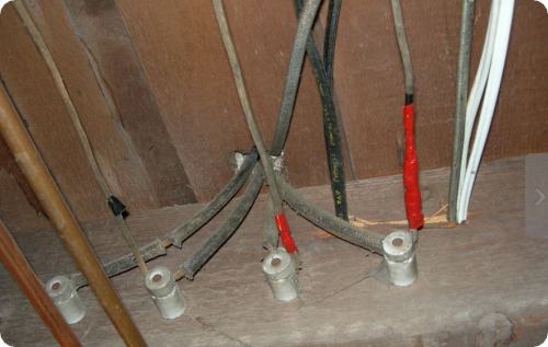 Knob-and-tube wiring strung along wooden framing on ceramic knobs and run through lumber via ceramic tubes was prevalent until the 1940s, but it needs replacing. They will not support the multiple electronics we use today; overloaded circuits can cause fires.