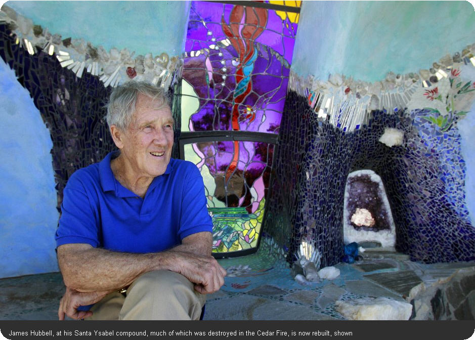San Diegans mourned when the 2003 Cedar fire damaged four of the beloved buildings, but Hubbell, his wife, Anne, and many friends quickly mobilized to rebuild them, with some improvements such as solar panels and a new kitchen. Another addition is a sparkling, sculptural shell just big enough to shelter one to three people in quiet contemplation.